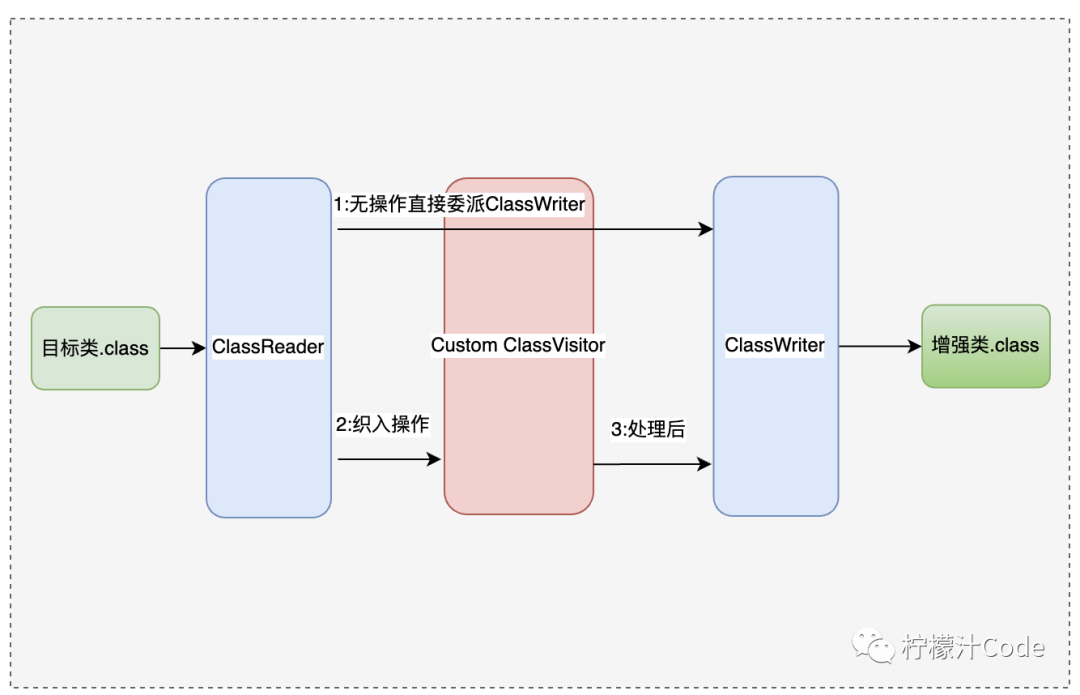 大体的执行流程是首先需要加载原 Class 文件,然后通过访问者模式访问所有元素,在访问的过程中对各元素进行改造,最后重新生成一个字节码的 byte[],如图: