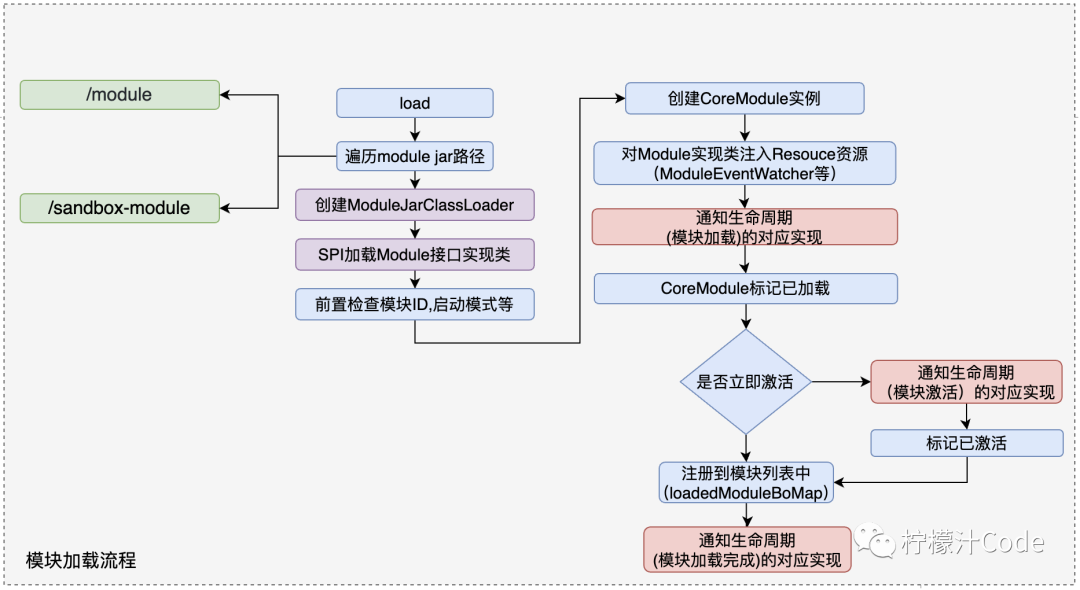 3. 通知生命周期中模块加载的对应实现(module 实现类可以同时实现 Module 接口以及沙箱模块生命周期接口 ModuleLifecyle 接口),在 ModuleLifecyle 接口对应的方法中,用户可以自定义实现业务逻辑。