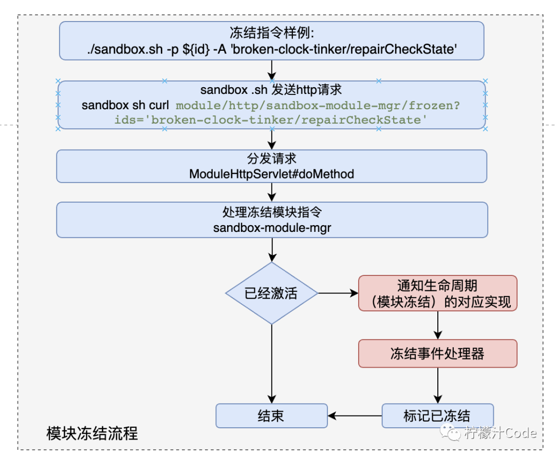 在启动脚本中,冻结指令也是发往 sandbox-module-mgr 沙箱系统管理模块