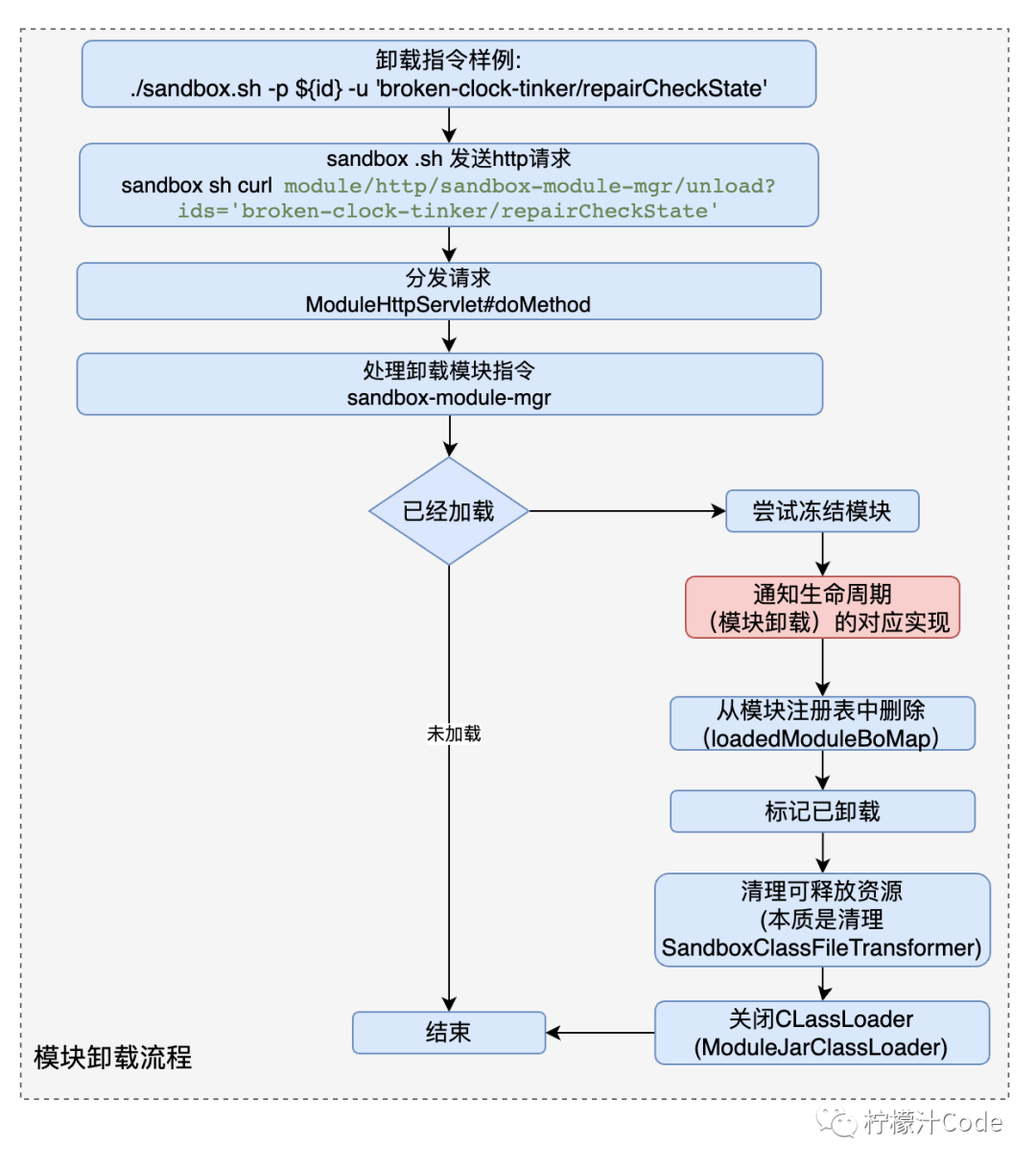 模块卸载将会把模块整个从沙箱中清理掉,之前给该模块分配的所有资源都将会被回收,包括模块已经侦听事件的类都将会被移除掉侦听插桩,干净利落不留后遗症