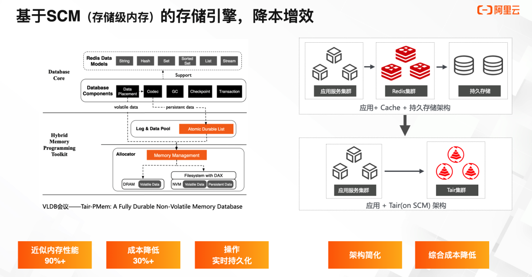 Tair自研系统对引擎自身和上下游系统进行了全面的埋点,最大程度收取数据并进行处理分析。面向客户侧,客户可以快速察看访问的用户数和Top的访问用户、Top的访问客户端来源、Top的执行命令等;也可以对实时热key进行分析,解决业务热点的问题;可以通过时延洞察分析延时较大的命令,以此来解决慢查询等。除了高性能的多线程处理引擎之外,Tair基于SCM存储级内存的自研存储引擎,对DRAM内存和存储级内存进行了混合分层存储,通过高效的数据放置和引擎设计,在吞吐上做到了和社区版Redis全内存基本相当,而单位容量的售卖价格会降低30%左右;同时,从内存的易失性到存储级内存的持久能力,Tair自研引擎的每个操作都能实时持久化,再配以系统层面的半同步机制,数据的可靠性大幅提升; 这项最新成果,我们也将之发布在了2022年的vldb会议上。