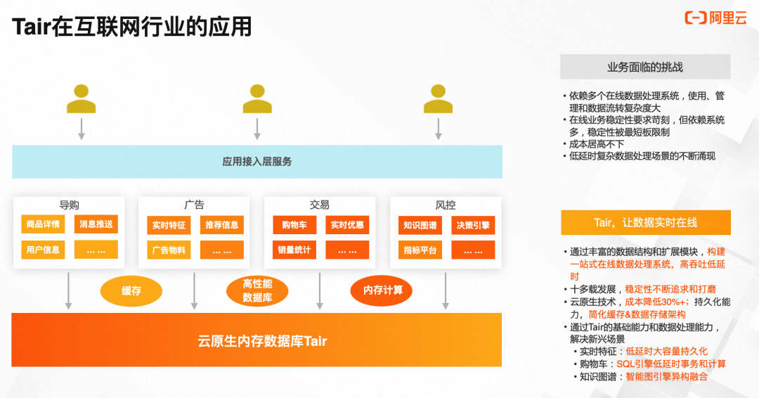 我们来看一下目前Tair在互联网行业的应用。拿一个电商来看,主要有导购、交易、广告和风控等,其实这里的大部分系统不仅仅在电商里有,在其他的社交、游戏、金融、出行等行业也都普遍存在。这里面有缓存的需求,例如导购场景下,商品的库存和价格;用户的session信息;广告场景下,广告物料等;也有高性能数据库的需求,例如消息推送,指标平台和实时特征等;同时也有不少需要图计算和内存计算处理的场景,例如购物车实时优化、知识图谱异构数据融合决策等等; 所以,Tair内存数据库,在各行各业的场景中,让数据实时在线。
