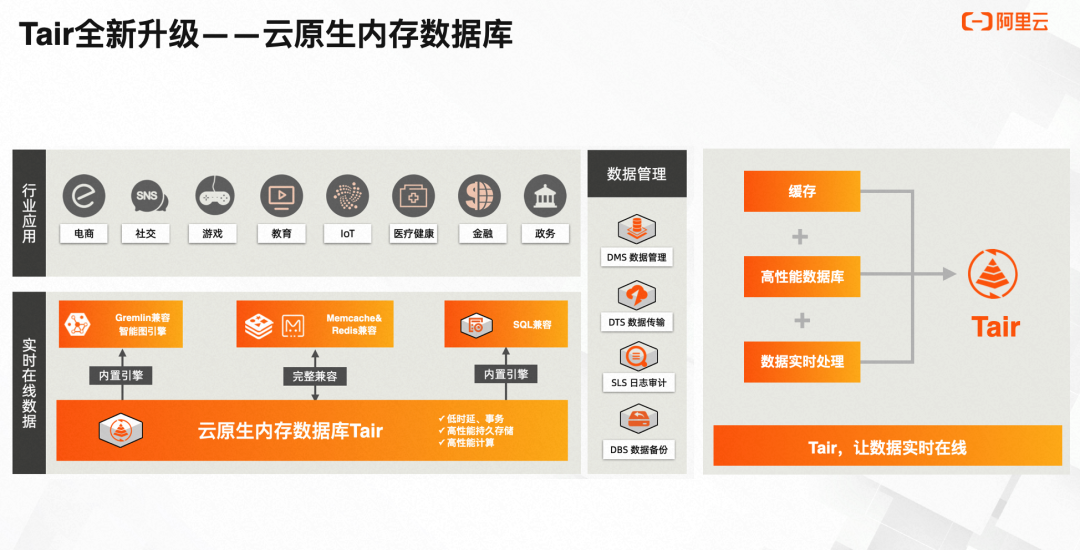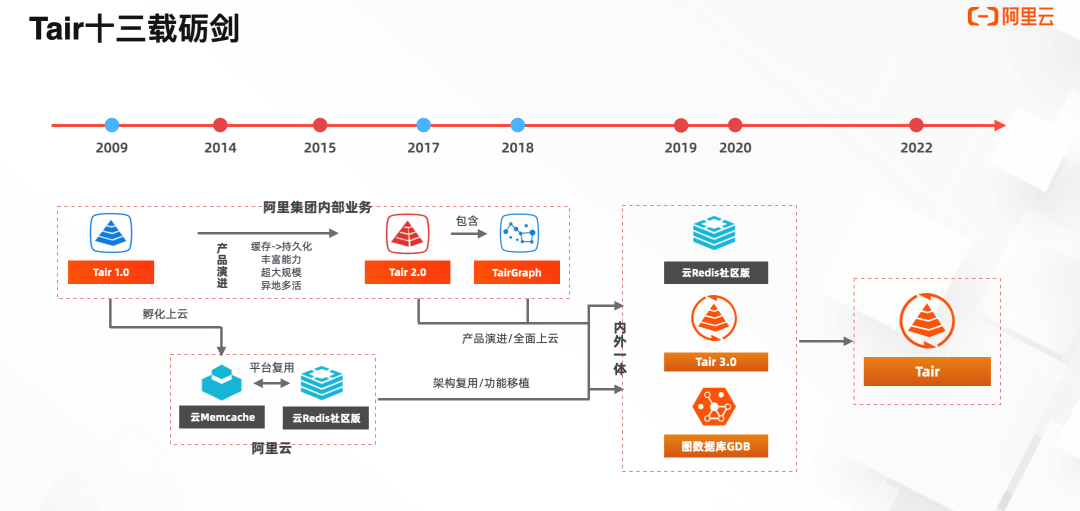 准确的说,Tair在阿里内部诞生已有十三年。很多朋友肯定会想,为什么会是十三年了?Tair最初是诞生在淘宝,定位是作为数据库之前的缓存,最开始用在了淘宝的用户中心;我们花了5年时间,将Tair从缓存演进到分布式KV存储兼备,场景也全方位覆盖了互联网在线业务,例如从淘宝的用户登陆、购物浏览、下单交易、消息推送等等都会访问Tair;技术上,这个阶段也伴随着单机到分布式系统的演进、存储介质的变化(HDD -> SSD) 、 新型存储引擎的兴起(LSM)等。2014年至2015年,我们逐步走向对外服务,兼容社区生态,在阿里云上推出了OCS(兼容Memcache)产品和Redis产品,为客户提供了开箱即用的产品服务。在2015年至2019年间,除了面向外部客户的云上Redis等产品迭代演进之外,Tair面向阿里集团内部的客户群体,重点打造低成本、高稳定性、客户使用体验等基础能力,支撑了阿里双十一每秒数十亿级别的访问量。同时研发丰富的模块扩展以应对不断涌现的新场景,例如孵化了TairGraph,以面向高度连接数据的存储和处理。2019年至今,Tair在兼容Redis生态和Gremlin生态的同时,结合云原生技术演进,在经历了十三载阿里内部和外部客户在线实时场景的大规模实践和积累后,正式对外推出云原生内存数据库Tair。随着互联网和产业互联网的发展,各个行业和系统都逐步走向了在线化,通过线上服务来满足客户需求。这个阶段,爆发了非常多、丰富的在线数据管理的需求。Tair内存数据库的定位,也从最初阿里内部承载超大流量的缓存,逐步扩展到提供高性能的、低延时的、支持多样化数据结构的实时数据处理系统。我们期待用一套可靠的高性能数据库系统,来服务客户更多的在线场景,让数据实时在线;同时,兼容业内的开源生态(Redis、Memcache、图数据库的Gremlin、SQL接口等);并结合云原生的技术,给客户提供更好的弹性、更低的成本、更高的稳定性、更优的体验。