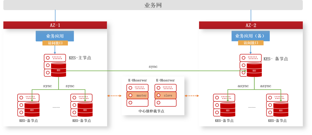 对于发生机房故障、断网、区域停电等区域级故障时,当前中心的所有设备将处于瘫痪状态。因此,对于数据可用性有较高要求的银行业系统,通常会设置灾备中心。为应对此类需求,KES数据库提供支持中心级自动故障转移的同城容灾方案。
