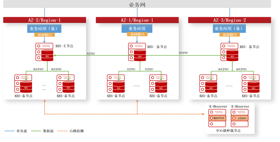 银行业对于重要核心系统均要求具备异地容灾能力,在应对此类需求时,KES数据库在中心级容灾方案基础上,提供可横跨上千公里的两地三中心方案。