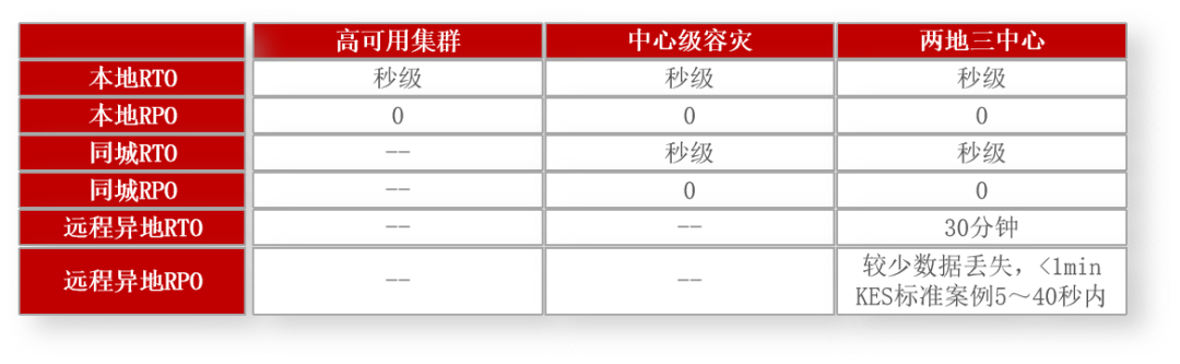 面对银行业对于数据库的极致高可用需求,人大金仓针对不同级别故障场景,均可提供满足“灾难恢复能力5级”要求的解决方案。