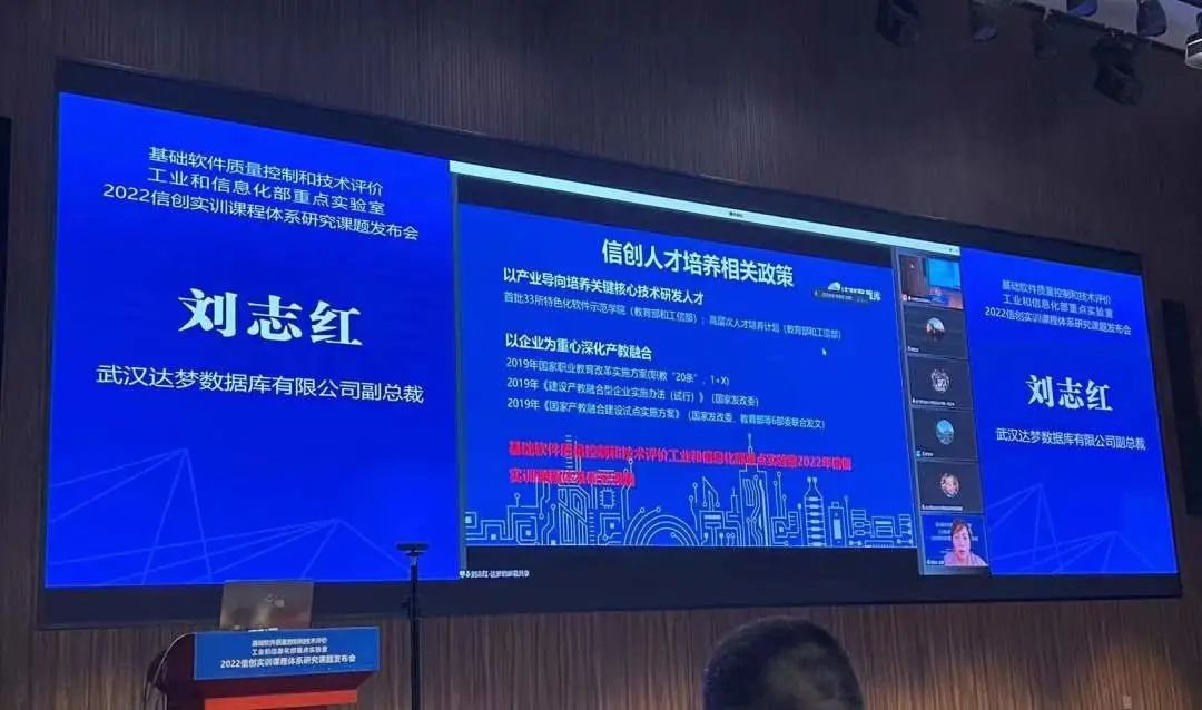 由中国电子信息产业发展研究院联合中国软件评测中心(工业和信息化部软件与集成电路促进中心),依托基础软件质量控制与技术评价工业和信息化部重点实验室(以下简称“重点实验室”)举办的“2022信创实训课程体系研究课题发布会”在京成功召开。发布会由中国软件评测中心副主任刘龙庚主持,中国工程院院士廖湘科、中国电子信息产业发展研究院副院长王世江出席发布会并致辞,武汉达梦数据库股份有限公司(简称:达梦数据)副总经理刘志红受邀参加本次发布会,并于线上分享了达梦数据在产教融合的实践和思考。