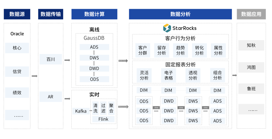 查询效率亟需提高。中原银行原有的基于MPP和Hadoop构建的数据平台查询效率较低,尤其是多表关联查询效率,BI平台的平均耗时超10秒,知秋系统平均耗时长达20秒以上,严重影响了对客户的深入洞察分析与对银行经营状况的管理。因此,该银行需要提高对业务、经营管理等数据的查询能力,尤其是对复杂的关联数据的查询能力,为其良好的分析性能提供保障。 需要升级数据平台架构,深入挖掘实时数据的价值。基于原有的数据平台架构,仅能支持T+1小时级别的准实时报表,需要等待最新的小时任务跑批完成,才可以查询最新时间的数据,难以满足银行在客户分析、风控管理等场景下的实时查询与分析需求。并且,原有架构中需要经过Oracle-AR数据传输平台-Kafka-Flink-Kafka的长链路才能实现对实时数据的查询与分析。因此,银行需要全面升级数据平台架构,尤其是数据分析层的架构,从而满足业务增长带来的实时需求。 需要统一数据架构,降低运维成本。原有数据平台流批链路复杂,运维成本高,且实时数据与离线数据的存储并不统一,存在冗余,造成存算资源的浪费。因此,中原银行需要简化数据平台架构,对离线数据与实时数据进行统一高效管理。