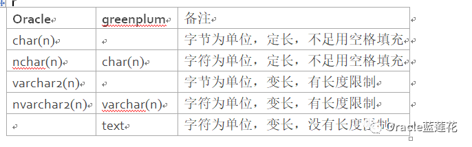 一般情况下,对于Oracle的char和nchar类型,直接换成green plum的char是没有问题的;而对于变长的varchar2和nvarchar2,想图省事的话,直接换greenplum的TEXT就可以。