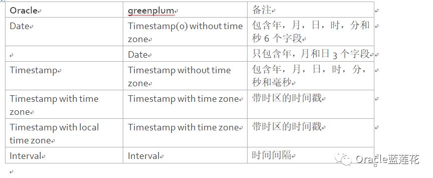 Oracle的日期时间类型向greenplum的数据迁移相对来说简单一些。由于greenplum的数据类型的极值超越Oracle,因此,数据迁移过程中,只要根据Oracle的数据精度,在greenplum中选择正确的数据类型,并留意一下二者写法的不同,应该就能够完整正确地迁移过来。