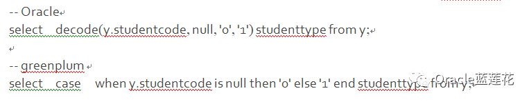 在greenplum中,decode函数是用来解码的,和encode函数相对。对于Oracle的decode函数,可以把它转换成case when的SQL语句,得到一样的效果。另外,Oracle也支持case when的语法,用法和greenplum一样。