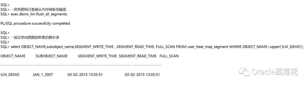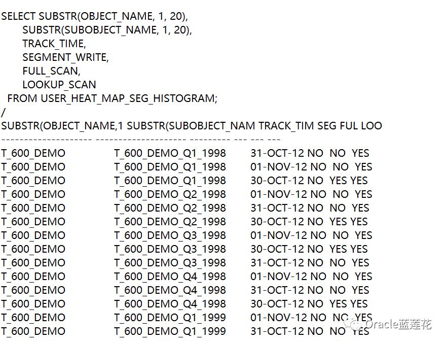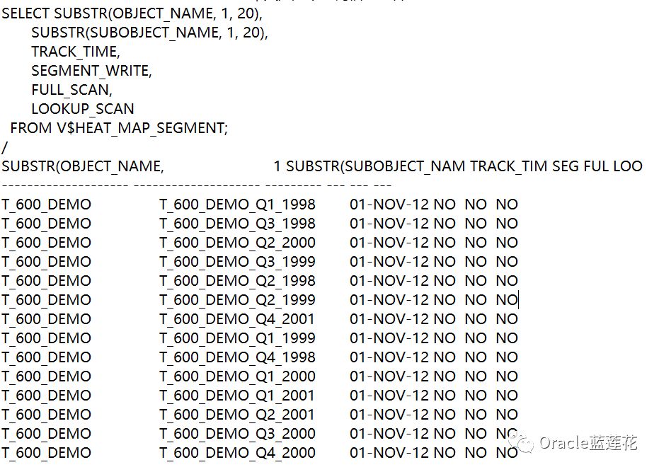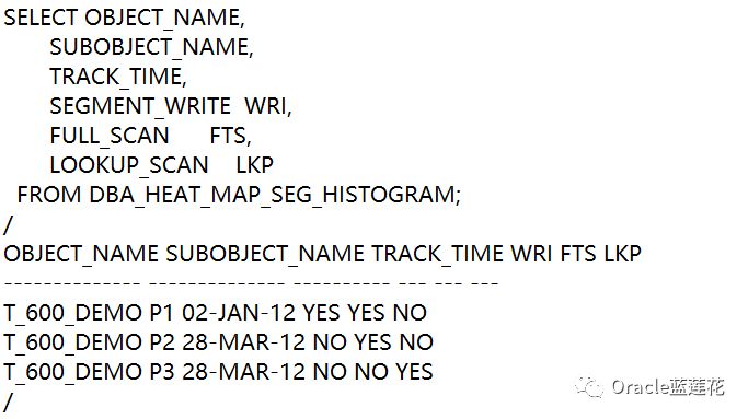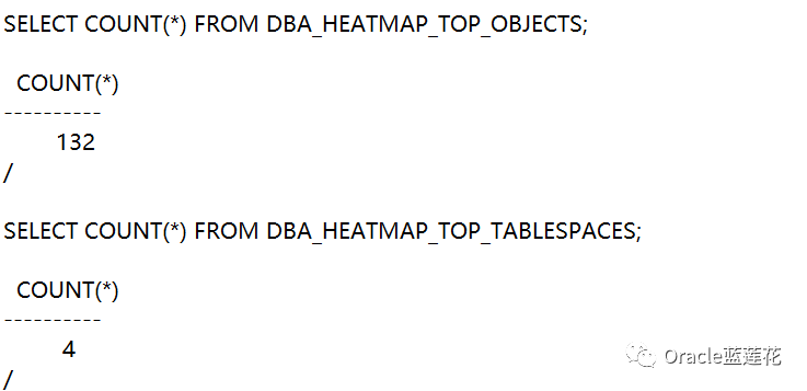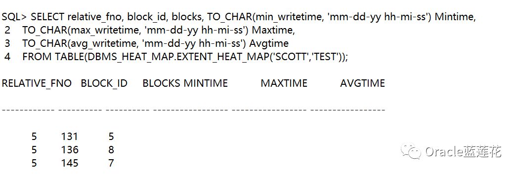 注意:表中的min_writetime、max_writetime和avg_writetime (DBMS_HEAT_MAP.EXTENT_HEAT_MAP())没有立即填充。