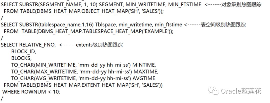 2.3热图在块级跟踪修改时间,在段级跟踪多个访问统计信息。系统中的对象和SYSAUX表空间没有被跟踪。DBMS_HEAT_MAP允许我们去访问各个级别的热地图统计数据包括我们关心的:block、extent、segment、objects和tablespace,非常的方便