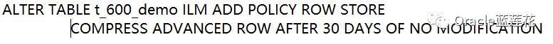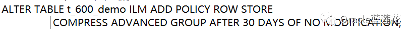 注意:1.该语句表示30天后,如果t_600_demo表数据没有修改(NO MODIFICATION)时,则t_600_demo表数据将自动按ROW STORE COMPRESS ADVANCED算法进行压缩