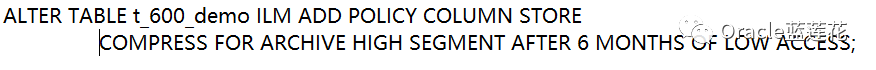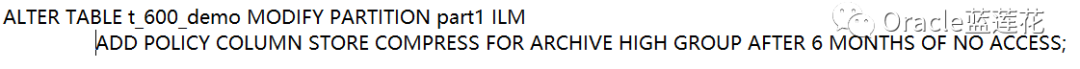 注意:1.该语句表示当6个月后,如果600 demo表数据没有访问(NO ACCESS)时,则600 demo表的part1分区数据将自动按COLUMN STORE COMPRESS FOR ARCHIVE HIGH算法进行压缩。