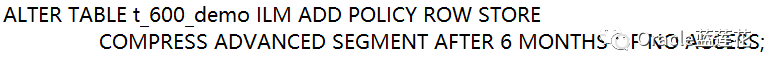 注意:该语句表示当30天后,如果600 demo表数据处于无修改(NO MODIFICATION)状态,则600 demo表数据将自动按ROW STORE COMPRESS ADVANCED算法进行行级(Row-level)压缩。