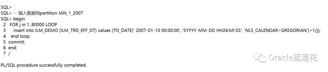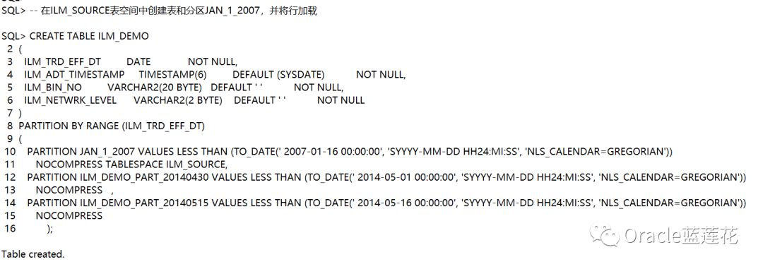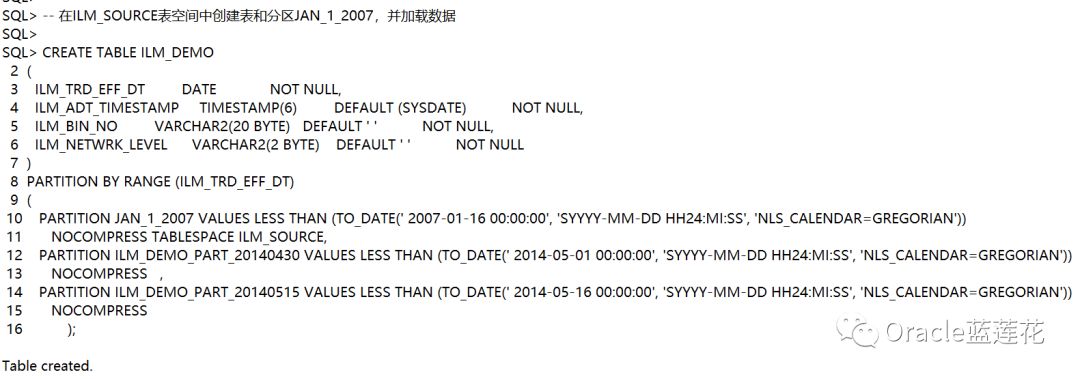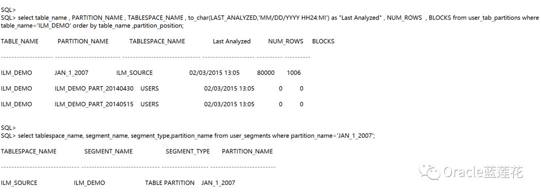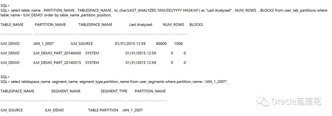 注意:1.该示例显示,分区JAN_1_2007最初存储在ILM_SOURCE表空间中。