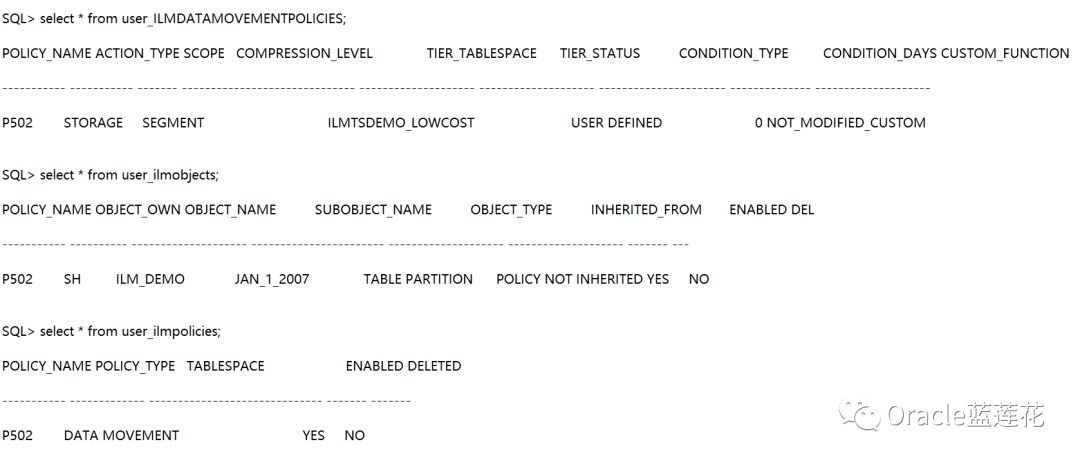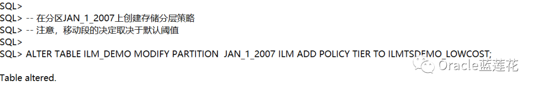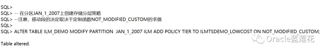 2.具体关键sql为ALTER TABLE ILM_DEMO MODIFY PARTITION JAN_1_2007 ILM ADD POLICY TIER TO ILMTSDEMO_LOWCOST;