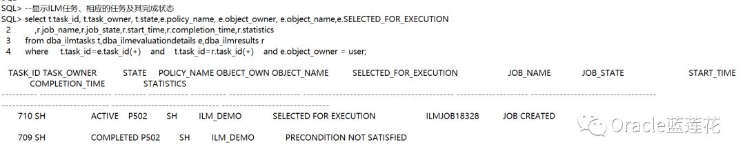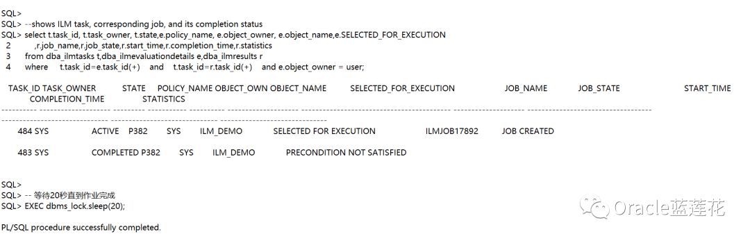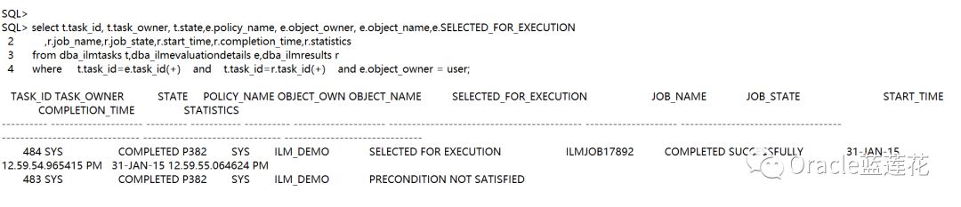3.我们还强制对策略进行评估,而不是等待维护窗口打开并触发策略评估和相应的作业,然后将分区JAN_1_2007移动到ILMTSDEMO_LOWCOST表空间。