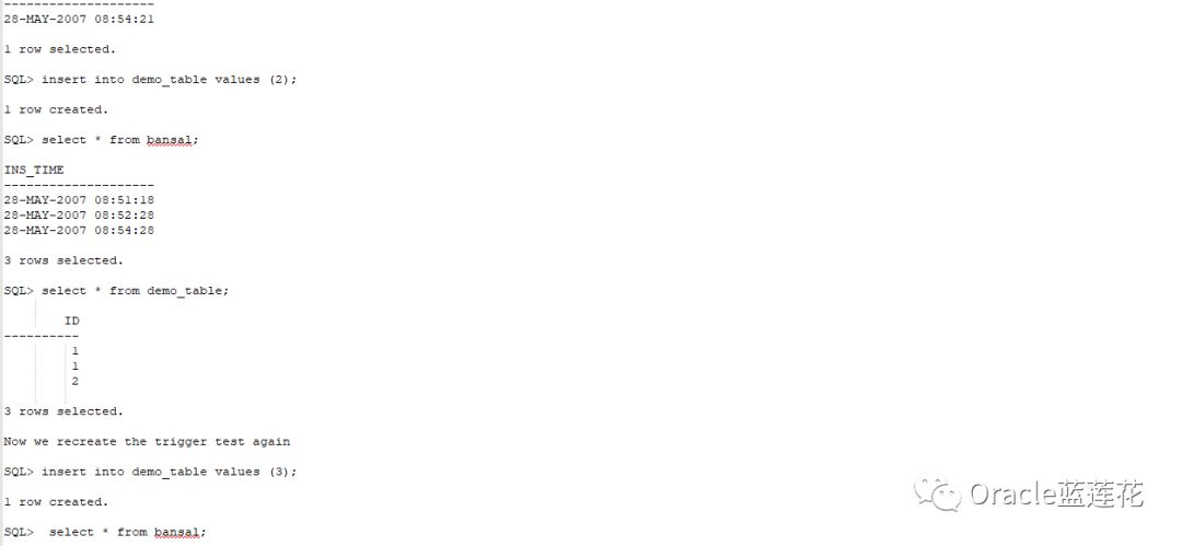 注意:与表关联的触发器的名称发生了更改以“BIN$xxx”表示,而不是“test”(如在删除表之前)。但触发器仍然还在工作,正如之前我们通过工作原理解释的