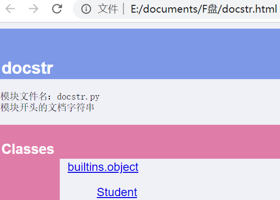 执行pydoc模块,将docstr的文档字符串写入到docstr.html文件,成为帮助文档。