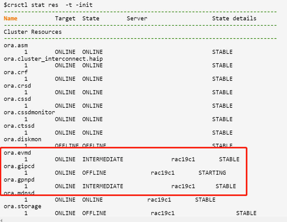 ora.gipcd资源状态 OFFLINE处于starting状态,ora.gpnpd资源状态为 INTERMEDIATE,这也异常状态。