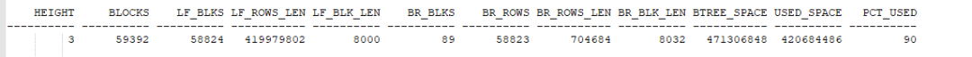 13.当前索引的高度为3,分配给segment的block为59392,对应的叶子块数量为58824,枝块数量为89 ,空间分配达到了449M,使用空间占比达到了90%