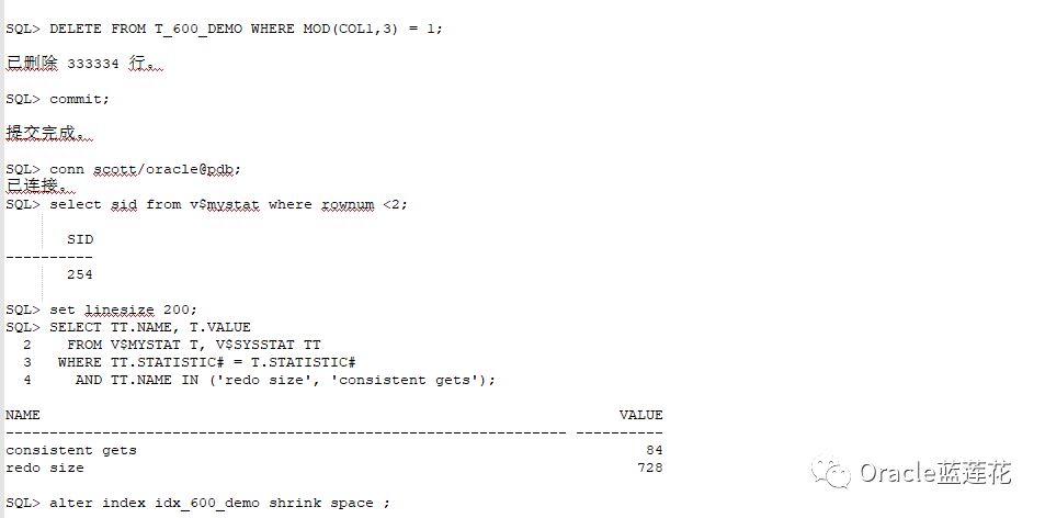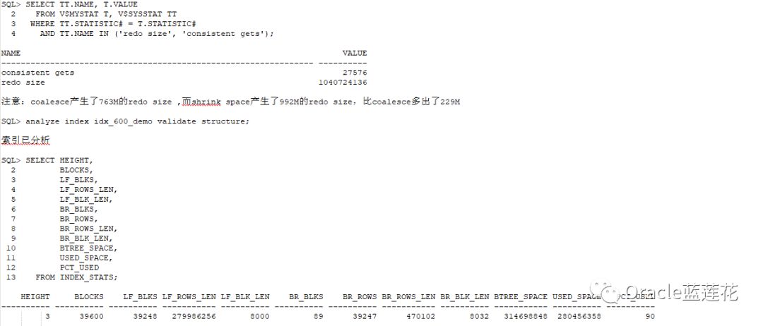 2.coalesce带来的redo size开销并不小,刚才的一笔coalesce操作就产生了763M的redo size ,不建议在生产环境业务繁忙期间对大表操作。