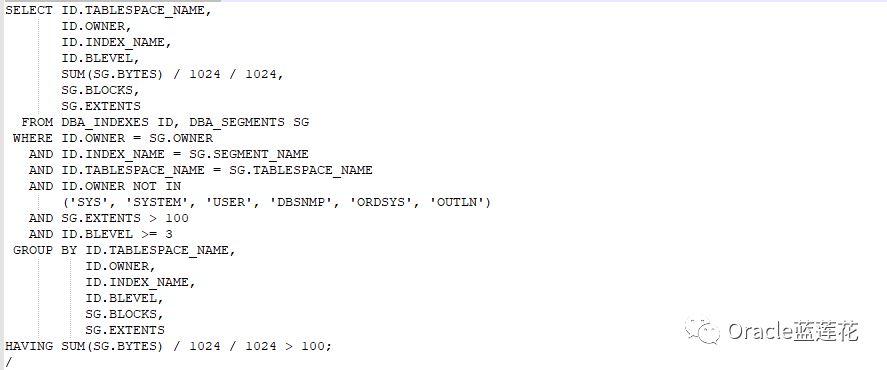 1.上述语句将显示索引高度Blevel >=3,并且索引大小超过100M的索引。