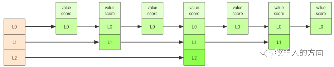 ZSet有序集合:也是string类型元素的集合,一方面是set保证内部value的唯一性,另一方面为每个value赋予一个score并按照score进行排序。在内部实现上使用的是跳跃列表的结构,类似于层级结构,最下面一层所有元素串联起来,每隔几个单元挑选另外代表再使用另外一级的指针串联起来。