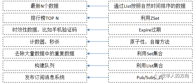 Redis作为内存分布式数据库,主要配合关系型数据库用作高速缓存,另外可以结合本身特性实现分布式锁、订阅发布以及延迟队列等功能。
