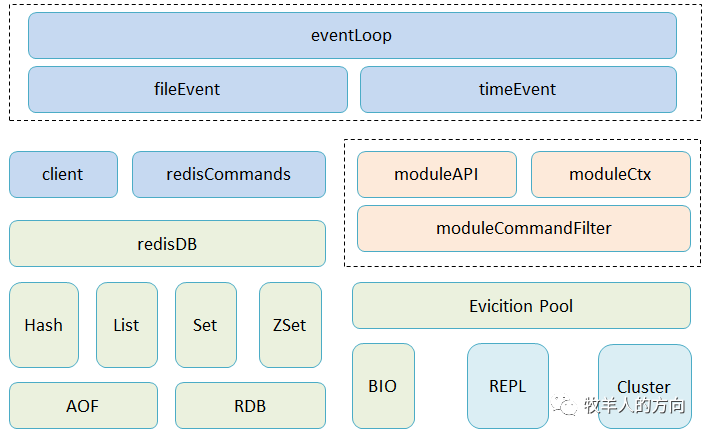 事件处理模块:利用AE事件驱动模型,进行高效的IO读写、命令执行以及时间事件处理,其中IO读写采用的是IO多路复用技术,后面会进行专项介绍
