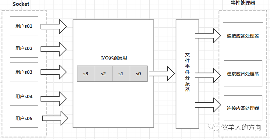 采用了非阻塞的I/O多路复用机制。利用select、poll、epoll可以同时监察多个流的I/O事件的能力,在空闲的时候,会把当前线程阻塞掉,当有一个或多个流有I/O事件时,就从阻塞态中唤醒,于是程序就会轮询一遍所有的流(epoll是只轮询那些真正发出了事件的流),并且只依次顺序的处理就绪的流,这种做法就避免了大量的无用操作。
