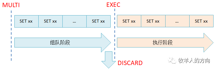 如上图所示,输入MULTI命令,输入的命令都会依次进入命令队列中,但不会执行。直到输入Exec后,Redis会将之前的命令队列中的命令依次执行。命令队列的过程中可以使用命令DISCARD来放弃队列运行。