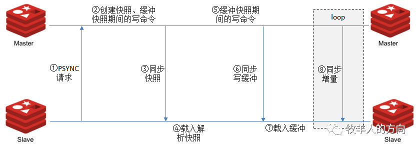 slave启动后,向master发送SYNC命令,master接收到SYNC命令后通过bgsave保存快照,并使用缓冲区记录保存快照这段时间内执行的写命令。