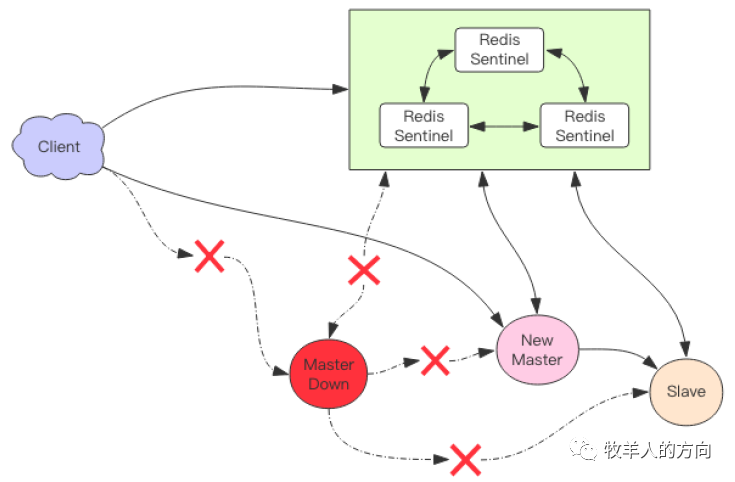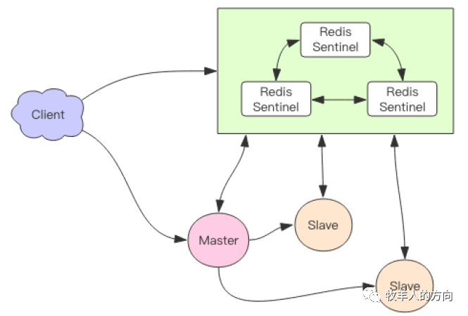 客户端连接Redis集群时,会首先连接sentinel,通过sentinel来查询主节点的地址,然后再去连接主节点进行数据交互。当主节点发生故障时,客户端会重新向sentinel要地址,sentinel会将最新的主节点地址告诉客户端。如此应用程序将无需重启即可自动完成节点切换。