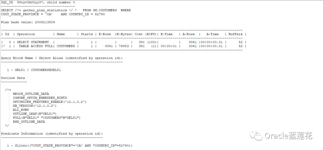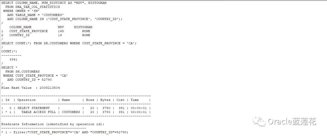 1.根据country_id和cust_state_province列的单列统计数据,cbo预估的美国加利福尼亚客户的查询将返回20行才。但实际上,有3341个客户居住在加利福尼亚,但是cbo不知道加州是在美国,因此通过假设两个谓词都减少了返回的行数,大大降低了基数反馈预估的结果。