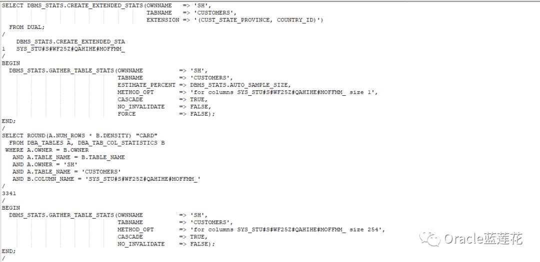 3.3这时候我们可以使用DBMS_STATS.CREATE_EXTENDED_STATS函数用于创建以前通过执行DBMS_STATS.SEED_COL_USAGE检测到的列组。