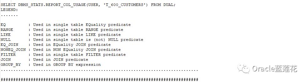 3.1我们可以使用DBMS_STATS.SEED_COL_USAGE和REPORT_COL_USAGE用于根据指定的工作负载确定表需要哪些列组。当我们不知道要创建哪些扩展统计信息时,这种技术非常有用。