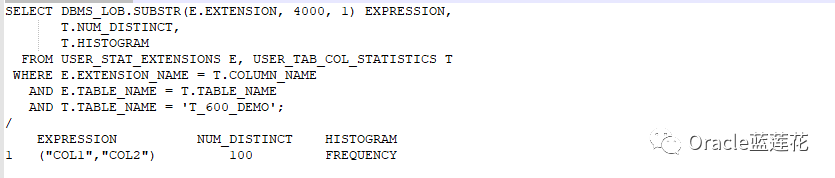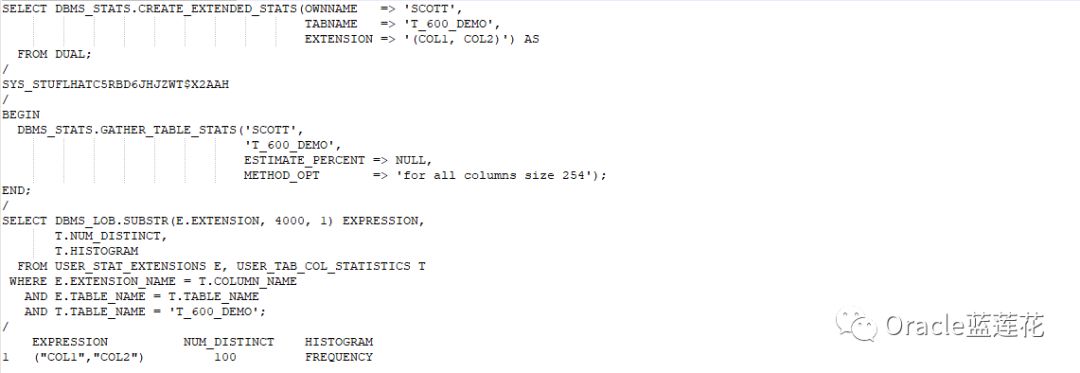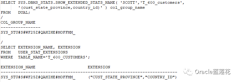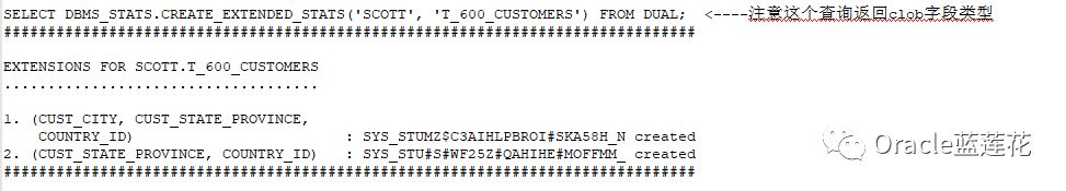 3.我们还可以使用DBMS_STATS.CREATE_EXTENDED_STATS函数用于创建以前通过执行DBMS_STATS.SEED_COL_USAGE检测到的列组。