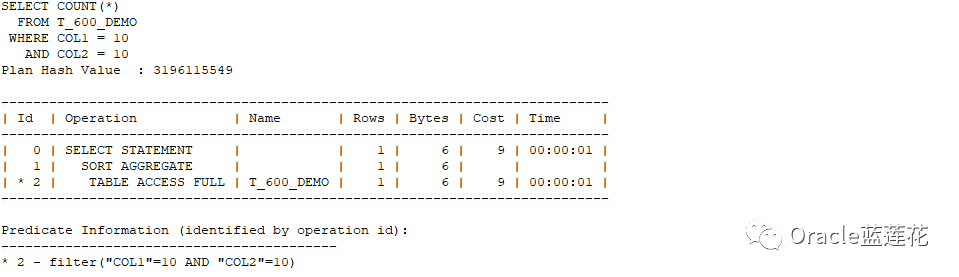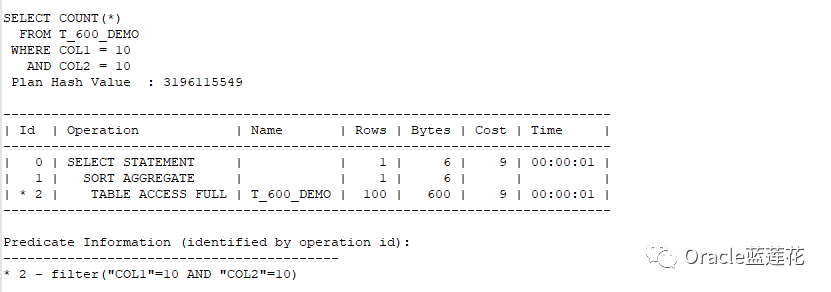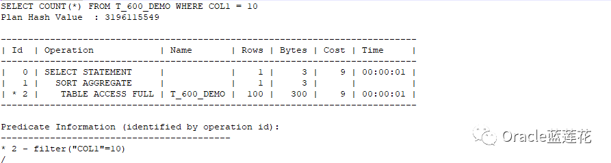 注意:OK的,没问题,cbo全表扫描t_600_demo表,预估的基数反馈结果为100行,实际的a_rows的查询结果也是100行