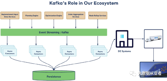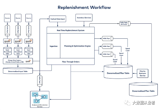在满足不断变化的客户行为的同时,实现上述所有系统和平台架构需求并非易事。下图简单展示沃尔玛当前业务规模: 沃尔玛的实时补货系统每天都要在三个小时内处理近1亿SKU数百亿条信息,为所有沃尔玛商店生成高精确度订单计划,吞吐量高达85GB消息/分钟。同时还要确保通过事件跟踪、数据重放、重试等方法做到不会丢失数据。 如上图实时补货工作流可以看出,计算框架使用微批处理架构Spark,数据源输入到Kafka,经过Spark处理后进入到非规范化视图(Denormalized Input Table),以便随时快速访问。实时补货系统中的计划引擎对数据进行处理,涉及库存位置、预测、库存阈值、配送中心、商店、配送方法等信息。以上工作都是每天处理近1亿SKU的3小时内完成的。然后通过不同层级的Kafka Topic发布整个实时补货计划。目前沃尔玛Kafka集群有18个Broker、20多个Topic,每个Topic都有500多个分区。 该文介绍了沃尔玛使用Kafka构建实时补货业务场景的相关内容。沃尔玛作为世界上最大的零售商,实时补货在满足数百万在线和非预约客户的需求方面发挥着关键作用,通过使用Kafka及其生态系统确保了所需库存的及时性和可用性。