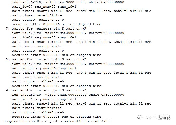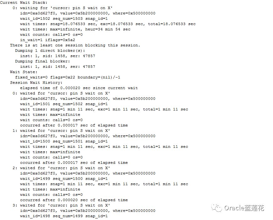 cursor:pin S wait on X等待事件,且相同的idn,被持有ibrary cache: mutex X等待事件的会话1458阻塞,接下来分析library cache lock的等待源头就能