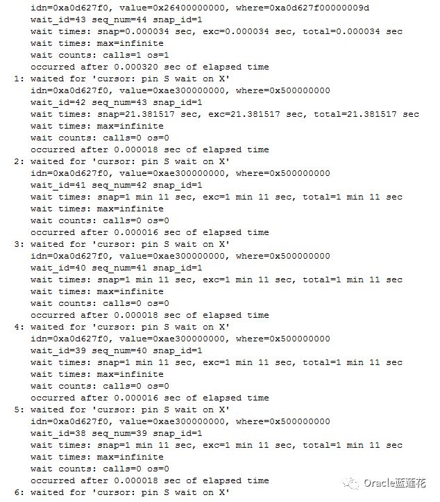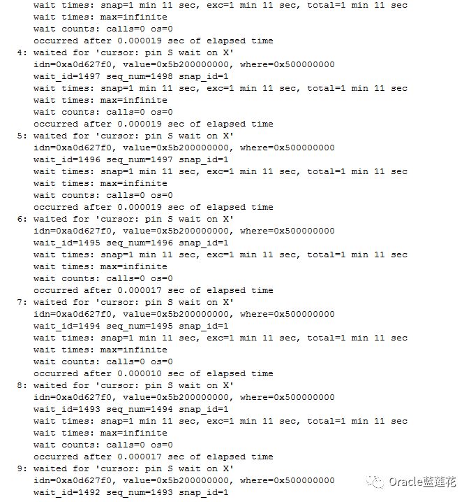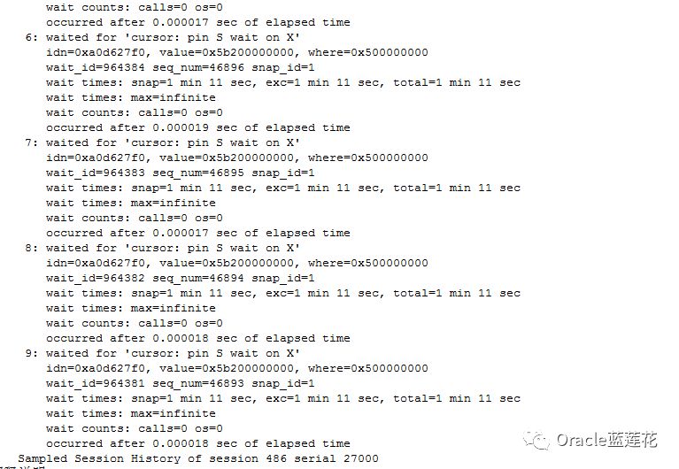 6.通过以上systemstate trace截取内容可以看到cursor: pin S wait on X等待事件对应会话都在同一个idn上,也就是会话从属为同一个hash_value