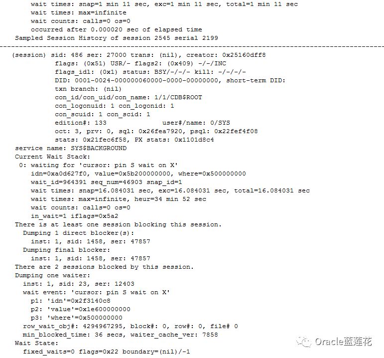 其中会话2784对应库缓存句柄为handle address=0x22f76fcc0,总等待事件为=34 min 34 sec,阻塞会话为2182,该会话持有cursor: pin S wait on X等待事件,