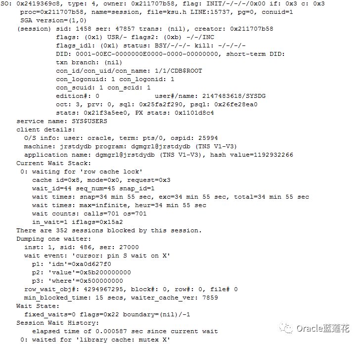 会话1458阻塞了352 sessions blocked,该对象持有row cache lock等待事件,对应row_wait_obj#: 4294967295,同时该会话在Session Wait History中持有