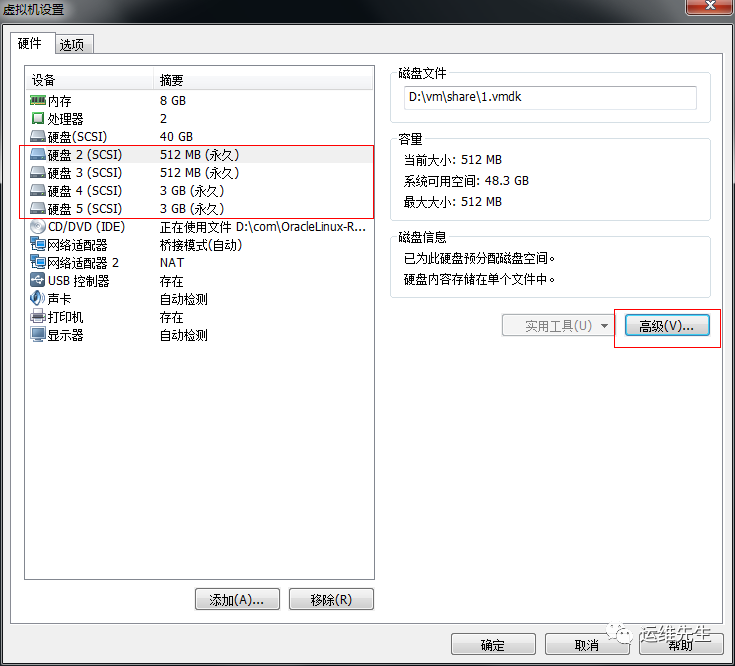 备注:磁盘高级里面,设置虚拟节点0.5G(SCSI1:0) 0.5G(SCSI1:1) 3G(SCSI 2:0) 3G(SCSI 2:1),2台节点必须设置一致,否则会错乱。