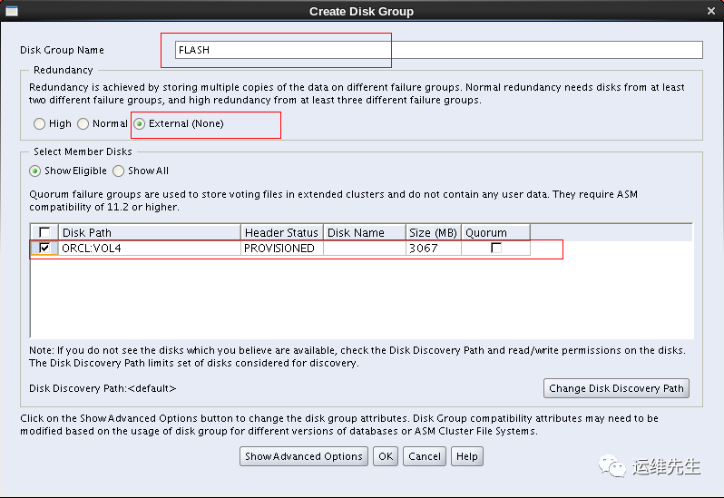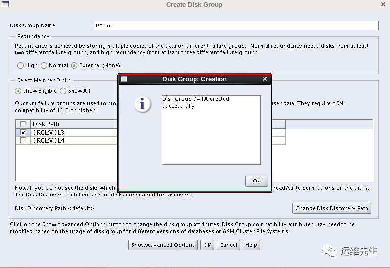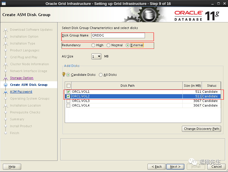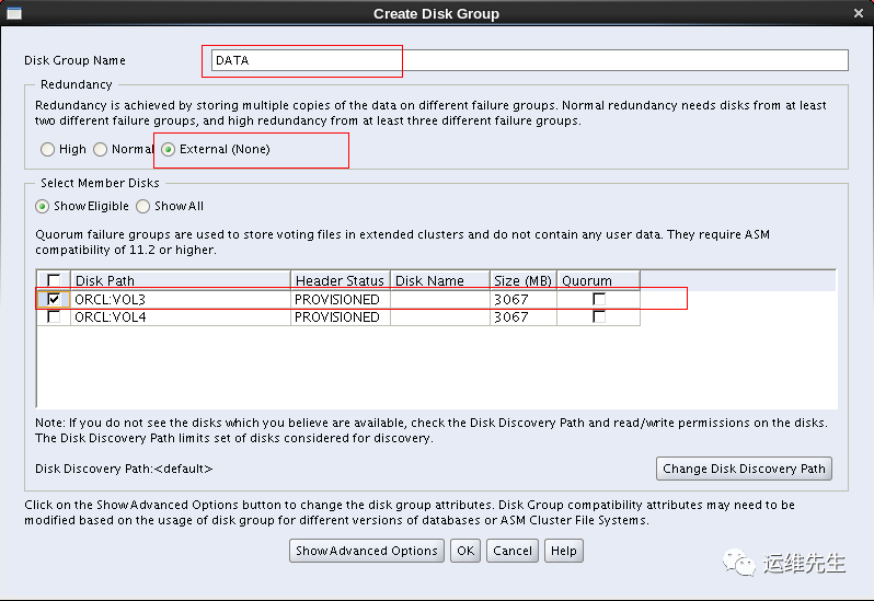 0.5G+0.5G GRIDDG磁盘组,存放OCR和Voting Disk