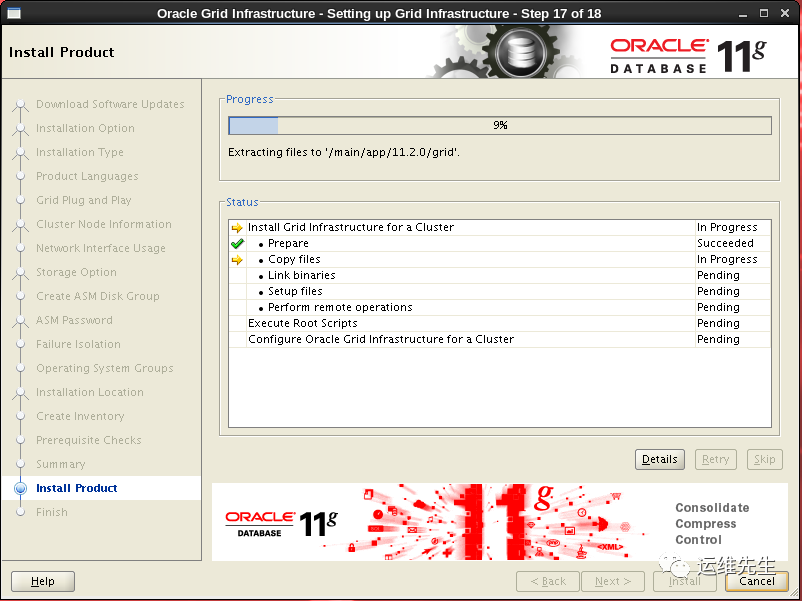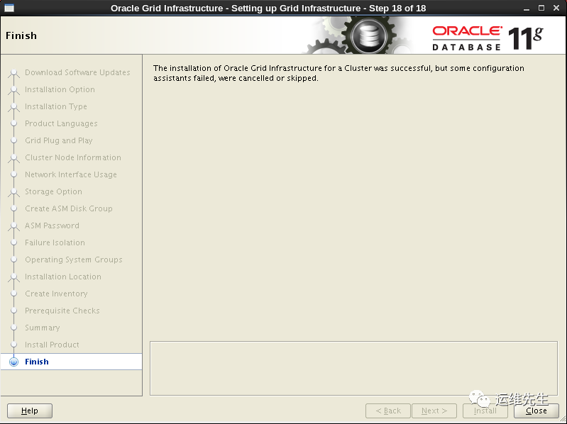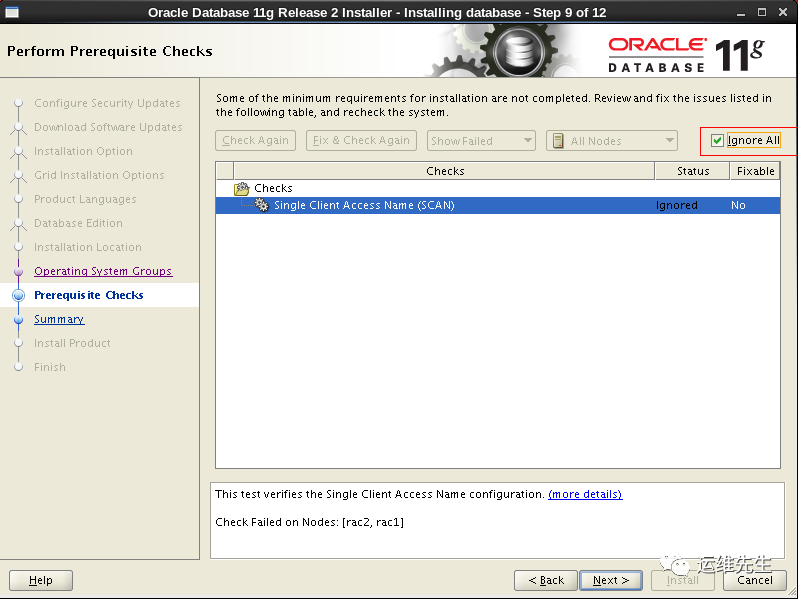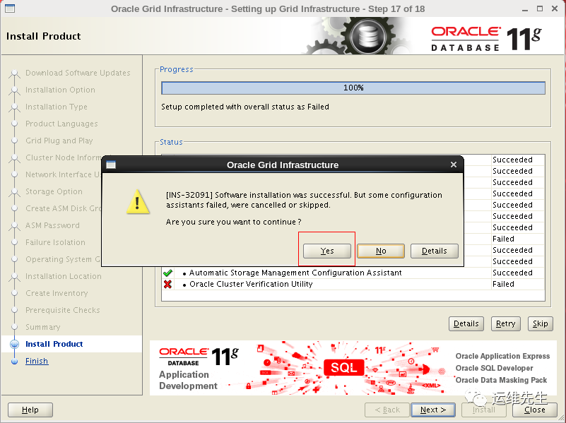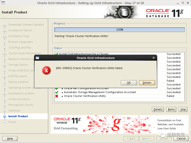 此步忽略此处错误,点击ok。因为没配置DNS服务器而报错,ping下scan ip如果能ping 通这个问题可以忽略到此步,Grid安装完毕