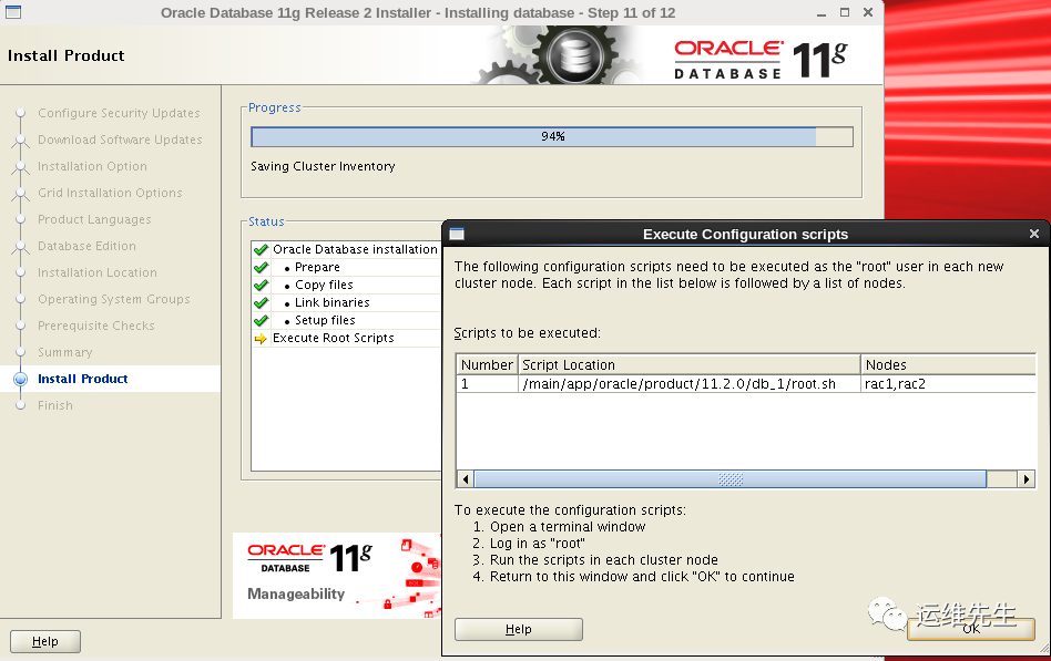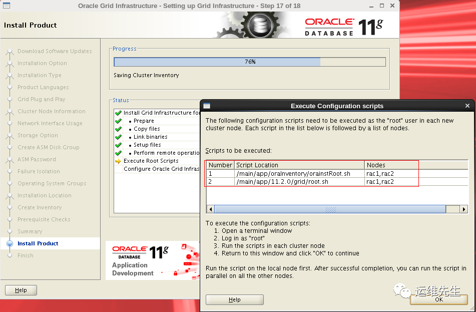 此问题,忽略即可点击Install按钮,开始安装弹出执行脚本命令:以root用户先在rac1执行,后在rac2执行,执行信息如下: